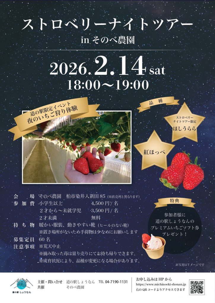夜のいちご狩り体験は道の駅しょうなんとの限定イベント。今年度はこれが最後となります!
